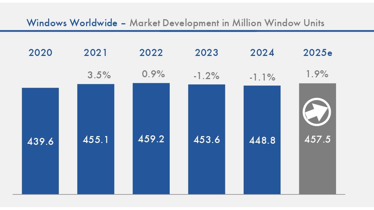 После сложного года для строительной отрасли мировой рынок окон начинает показывать первые признаки восстановления. В 2024 году общий объём рынка составил 448,8 млн оконных блоков, что означает снижение на 1,1%, тогда как доходы производителей сократились на 1,7%, до 81,1 млрд евро.