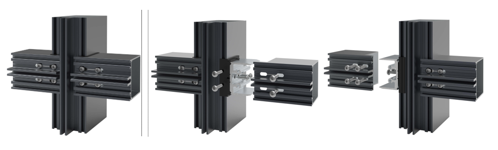 Стык создан по принципу «последовательного монтажа», что позволяет добиться максимальной жесткости соединения и высокой точности узла. Конструкция стала современной альтернативой предыдущим моделям 220312 и 220312М, обеспечивая более плотное прилегание к стойке и полностью устраняя риск проворачивания ригеля во время эксплуатации. Решение ориентировано на проекты, где ключевым является долговечность, стабильность и геометрическая точность фасада.