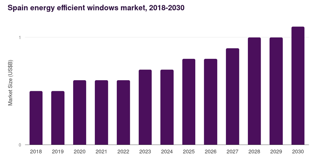 2024 рік – 721,5 млн. доларів США. Очікується, що ринок енергоефективних т вікон в Іспанії досягне прогнозованого об’єму в розмірі 1,083,9 мільярда доларів США до 2030 року. З 2025 по 2030 рік від ринку енергоефективних вікон в Іспанії очікується сукупний темп зростання на рівні 7%.