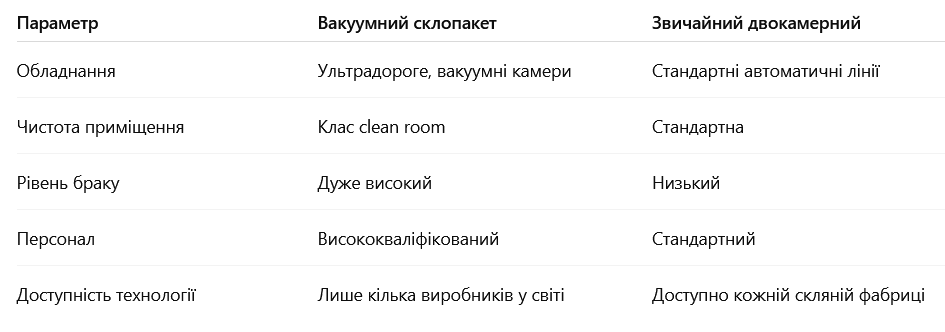 - VIG-склопакет: у 3–6 разів дорожчий за звичайний двокамерний із енергозберігаючими напиленнями.